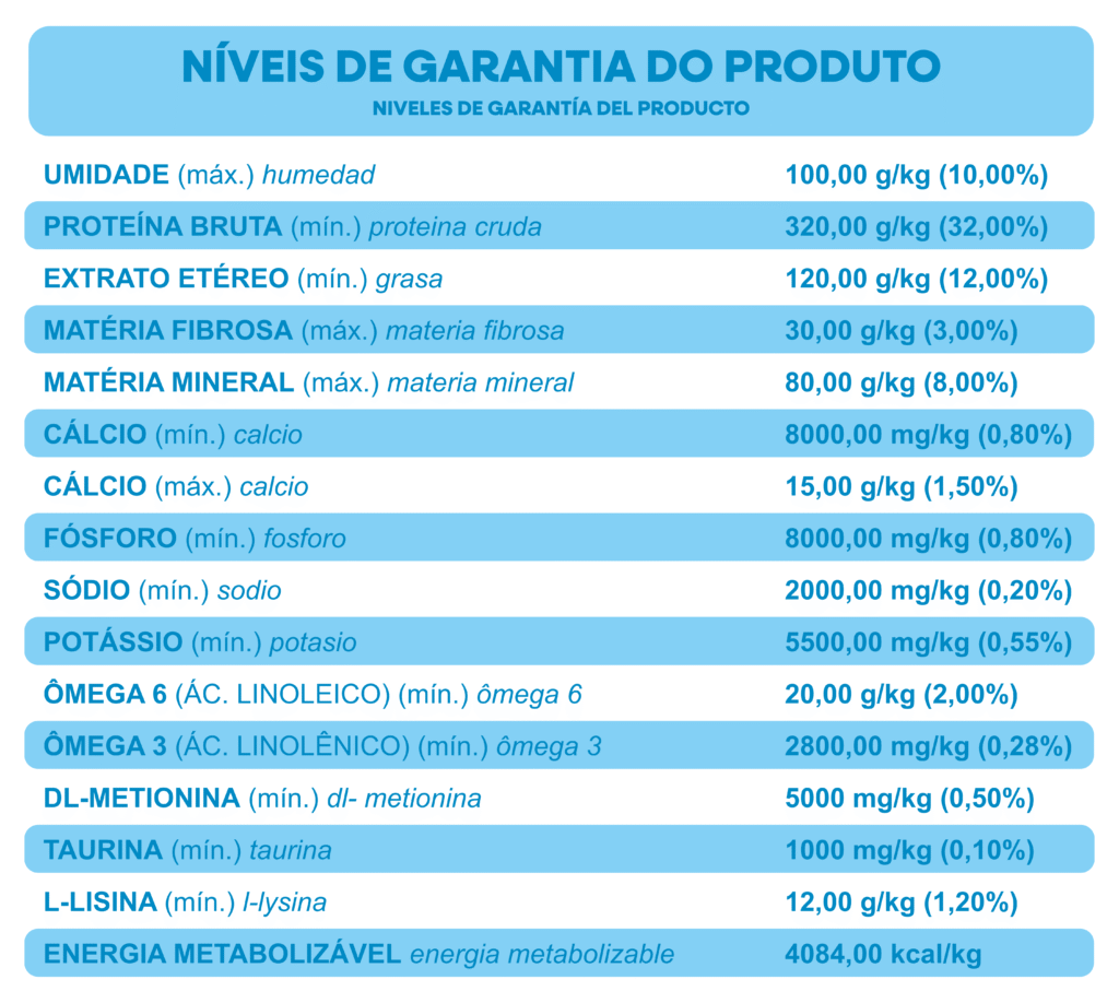 aditivo regulador de acidez, L-lisina, DL-metionina, Taurina, vitamina A, vitamina D3, vitamina E,